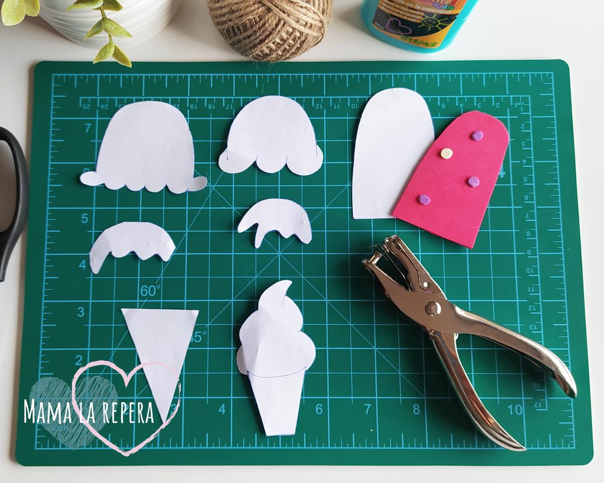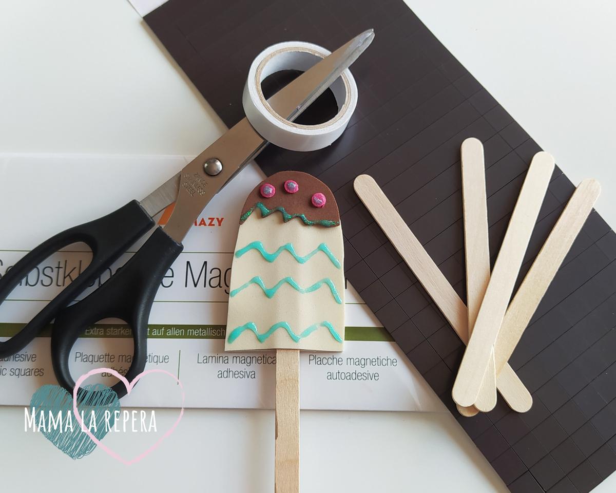 Os voy a explicar paso a paso como hacer los imanes para la nevera. Nosotras nos hemos decantado por los helados, pero podéis hacer infinidad de figuras creativas según los gustos de vuestros los peques.Goma eva de colores