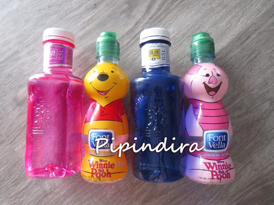 Aquí tenemos las 4 botellitas que se compraron mis niños el otro día que nos fuimos de compras. Las guardamos para reciclarlas y al final les dimos otro uso. La azul y la rosa al no tener dibujos van decoradas.