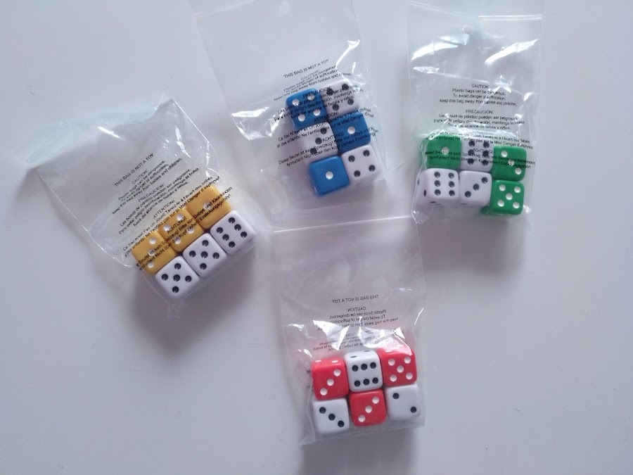 Primero cada jugar elige un color (rojo, azul, amarillo o verde). Seguido se le entregan sus dados, tres de su color y tres blancos, así como el soporte o base para los dados.