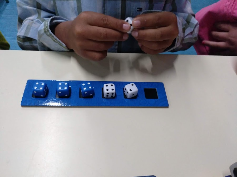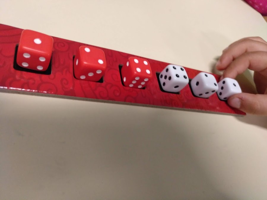 Según las instrucciones, debemos ir lanzando todos los dados hasta que nos salgan los números que debemos ir colocando en el orden indicado. El azar juega por lo tanto un papel importante.