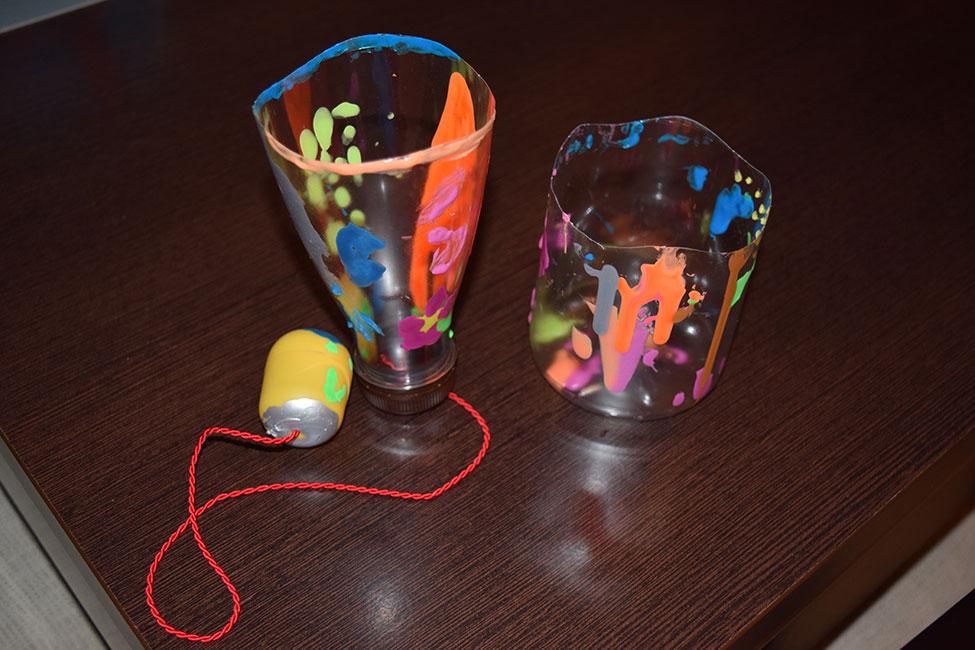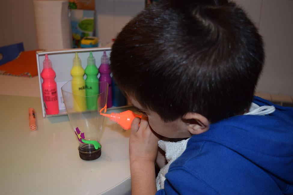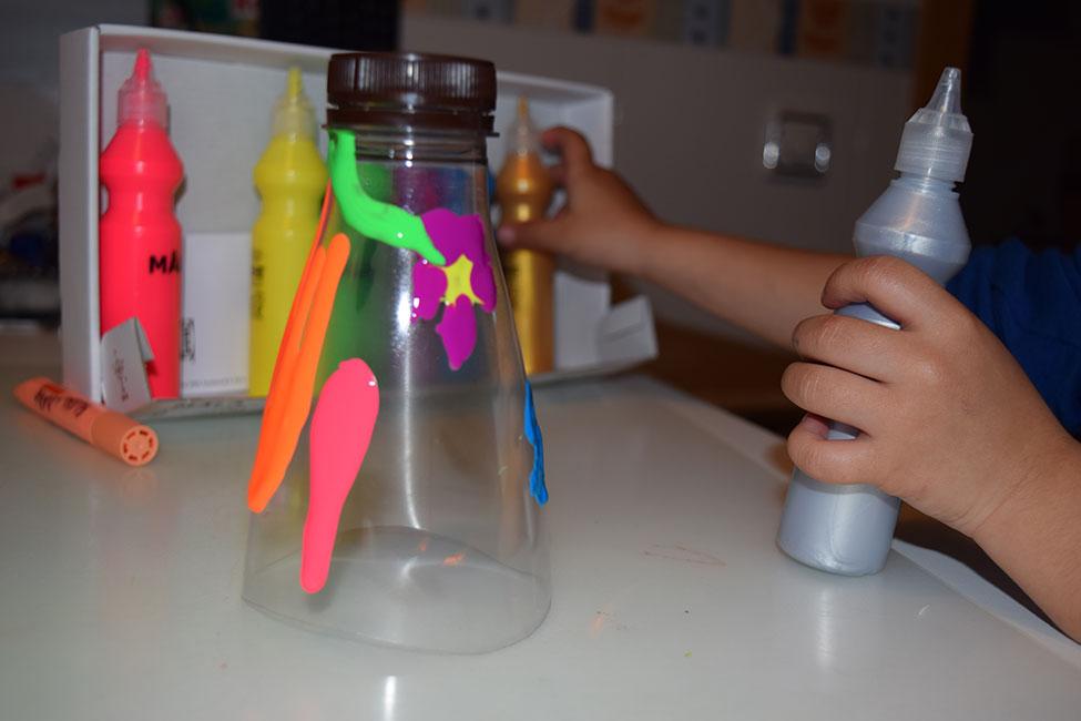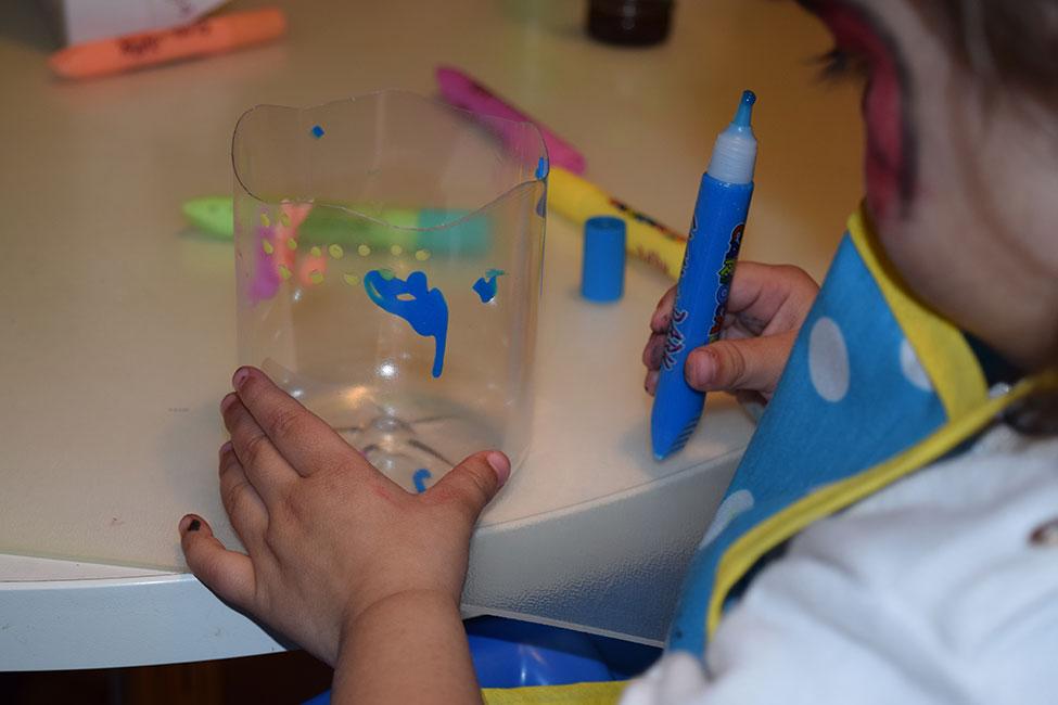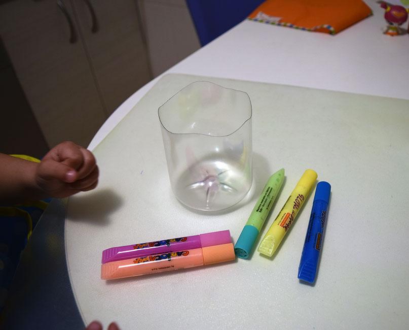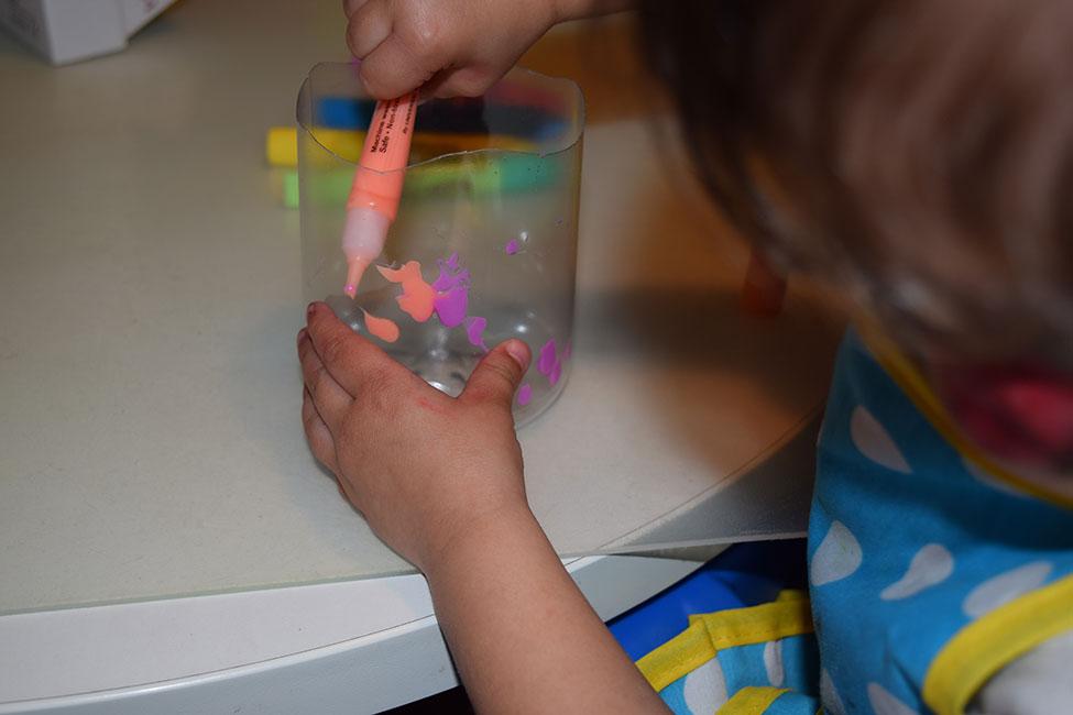 La pequeña, pues le sugerí rellenar el envase por dentro de puntitos, rallitas y cosas así, y ella aplicó toda su creatividad para dar colorido al plástico.