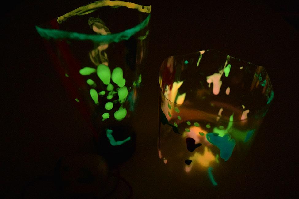 Por otro lado, la peque se puso a utilizar las pinturas que brillan en la oscuridad, con el objetivo de hacer algún botecito decorado para la habitación. La idea era hacer un frasco que brilla en la oscuridad como el que había visto en Guía de Manualidades, pero con pinturas un poco menos específicas y manos un poco menos expertas, jajajaja