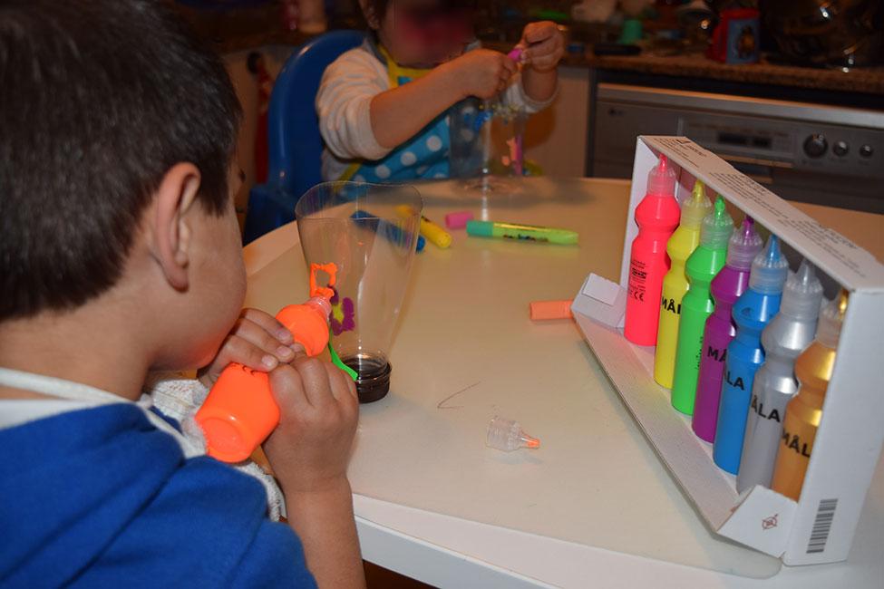 Por un lado, mi peque mayor decidió pintar con las pinturas de Ikea y la parte de la botella con la que íbamos a hacer el juego, la que tiene el tapón.