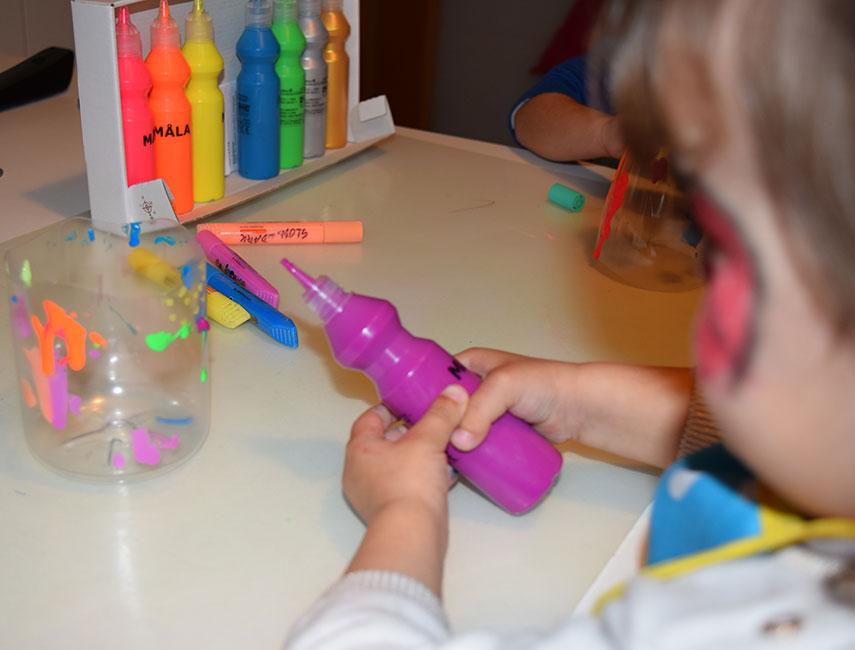 Pinturas. En el link de kokotak usan rotuladores permanentes, pero nosotros queríamos probar las pinturas MÄLA de Ikea, que nos encantan porque son como temperas en botellita. A la vez también utilizamos pinturas que brillan en la oscuridad de la marca Carioca, que encontré en un bazar.
