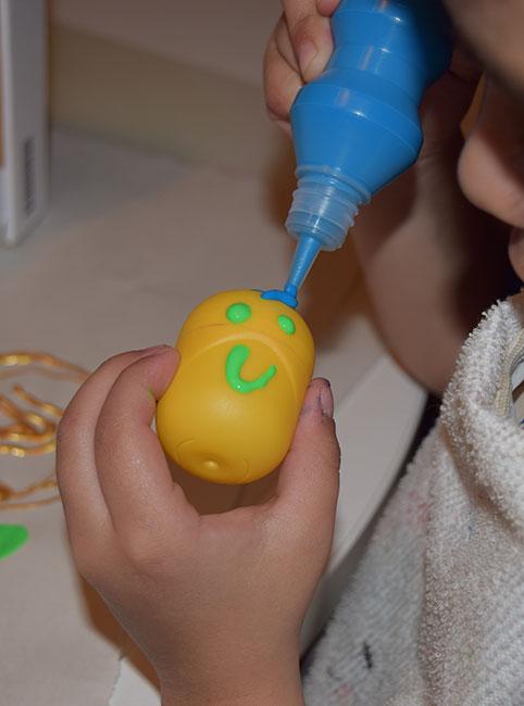 Por último, el mayor pintó la bolita amarilla del huevo kinder como si fuera una personita, con ojos, boca y pelo azul.
