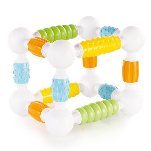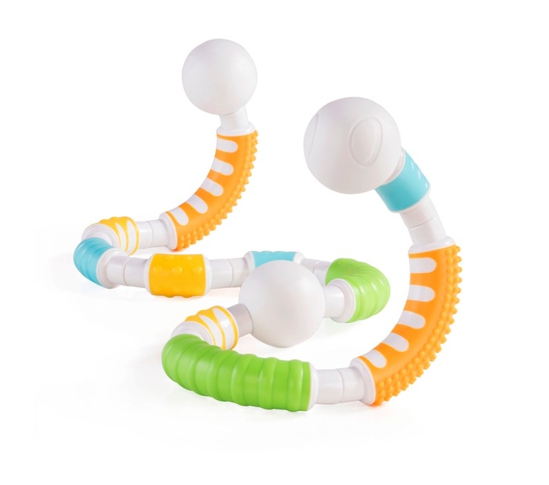 Los tubos también son suaves al tacto pero al contrario que las bolas, éstos ofrecen diferentes motivos en relieve: estrías, lunares, triángulos, hendiduras, anillos ¡Todo un mundo de exploración para las curiosas manitas de los peques!