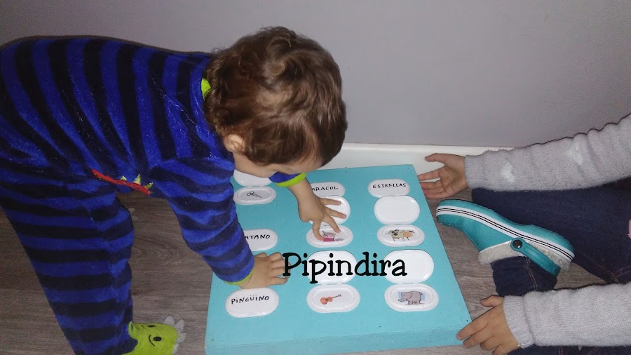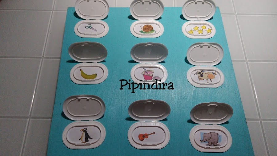 Después de aprendernos los nombres de los dibujos los hemos escrito en la tapadera y volvemos a hacer el juego.