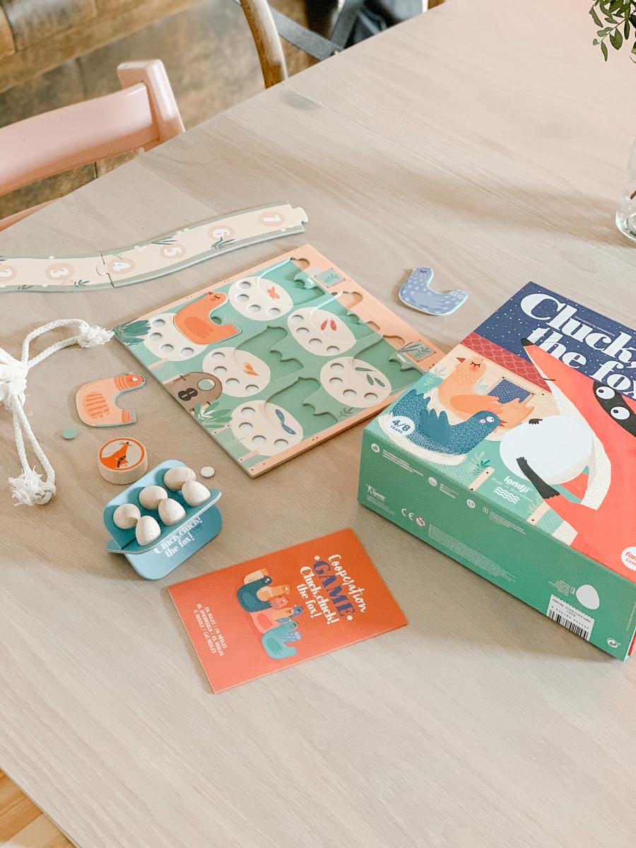 Cluck, cluck the fox! Es un buen juego cooperativo para jugar en familia donde todos los miembros tendán que intentar que el zorro no se coma los huevos de las gallinas. Como véis tiene piezas pequeñas de madera así que tenéis que ir con cuidado si como nosotros tenéis peques en casa que les encanta ponérselo todo en la boca. Está hecho completamente de cartón y a Valentina le encanta montar las estructuras para guardar los huevos de madera.