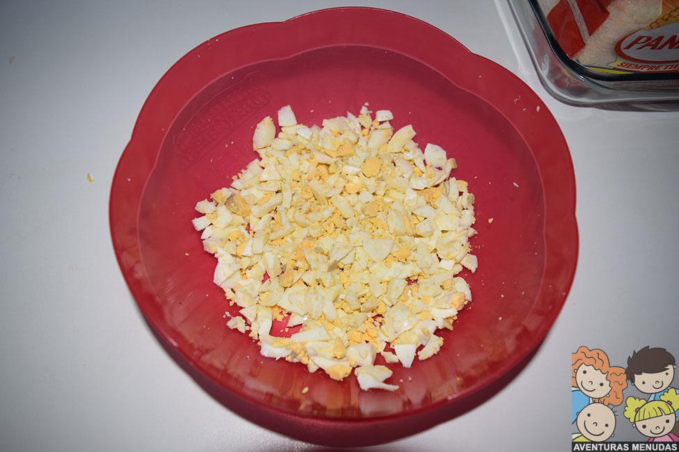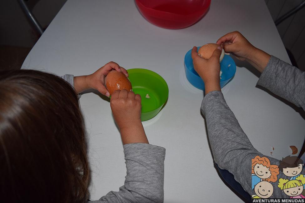 Lo primero hervimos los huevos para hacer huevos cocidos. Los pelamos una vez se enfríen. Esta es una de las tareas que más gusta a los peques, ¿lo habéis probado? Simplemente pelar huevos duros….