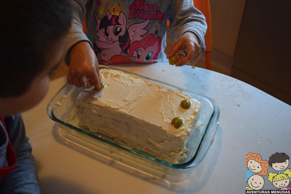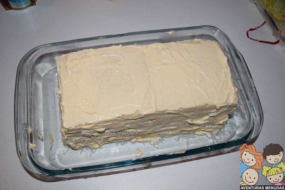 Vais haciendo capas de pan de molde y mezcla, hasta tapar la última capa con pan de molde solo. Nosotros pusimos 3 pisos más la tapa final de pan de molde. Después cubrís todo con mayonesa, por todos los lados.