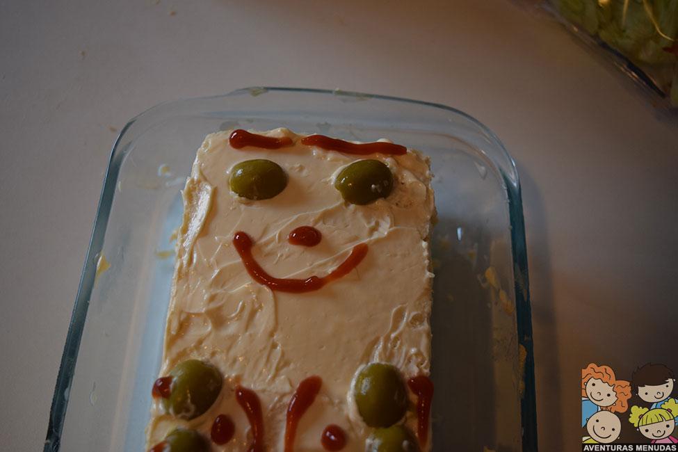 Y decoráis al gusto, con aceitunas, ketchup, zanahoria, pepino, lechuga, como queráis.