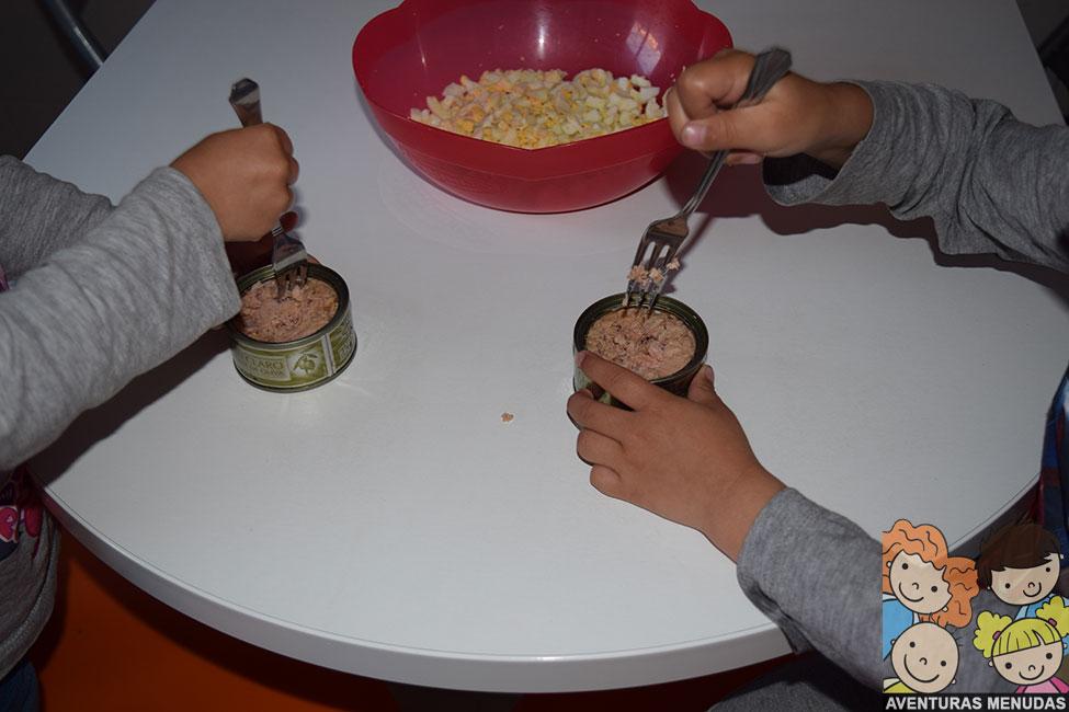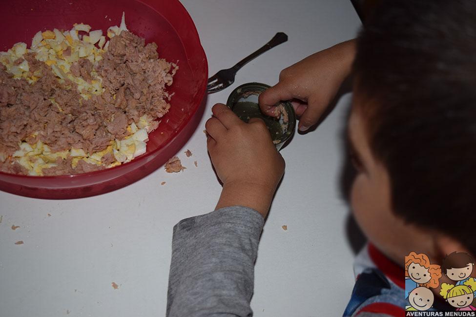 Incorporamos el atún. Según el tamaño del pastel, necesitaremos más o menos cantidad de atún. Nosotros pusimos dos huevos duros y dos o tres latas de atún.