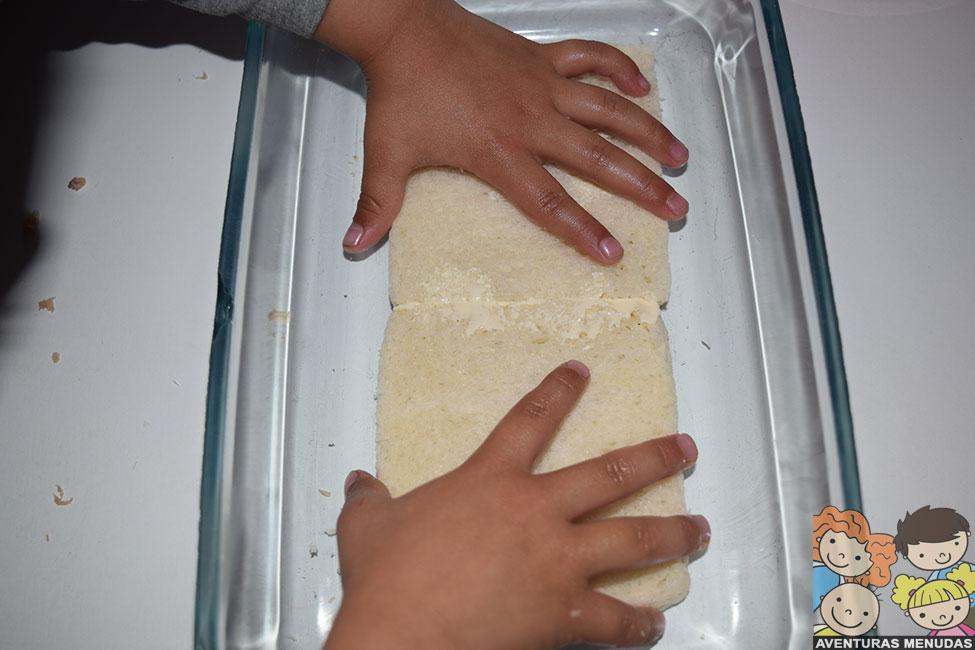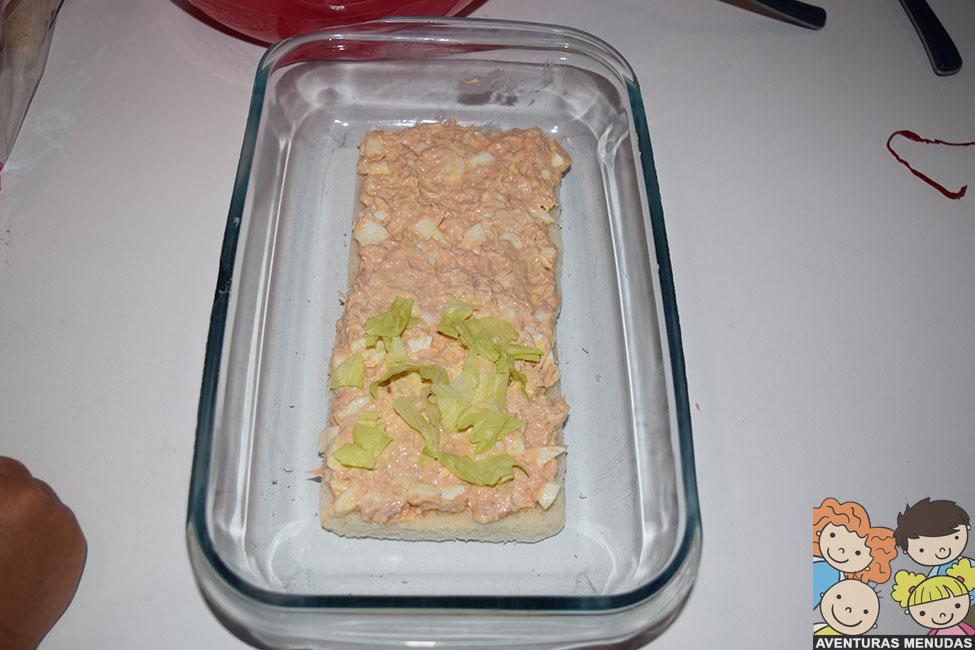En una bandeja colocáis una base de pan de molde. Podéis pegarlas por el medio con mayonesa.