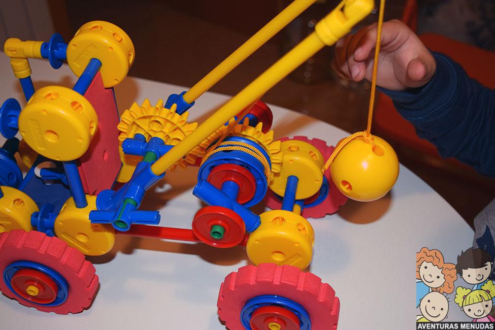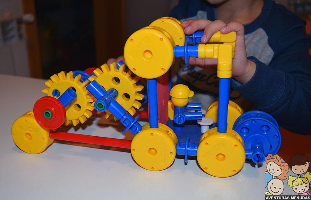 En nuestro caso, nos pusimos a montar uno de los retos bastante complicados que ofrece el manual, una especie de demoledora, con poleas y ruedas dentadas.