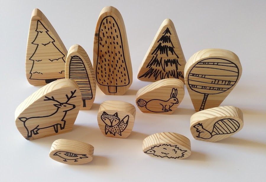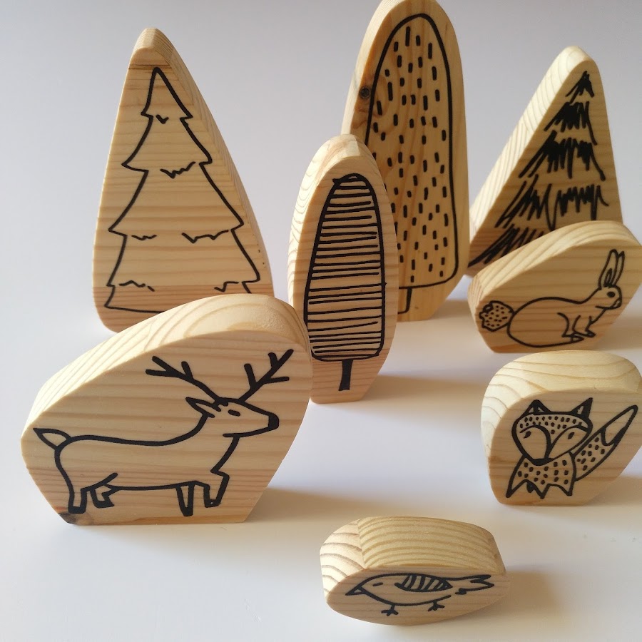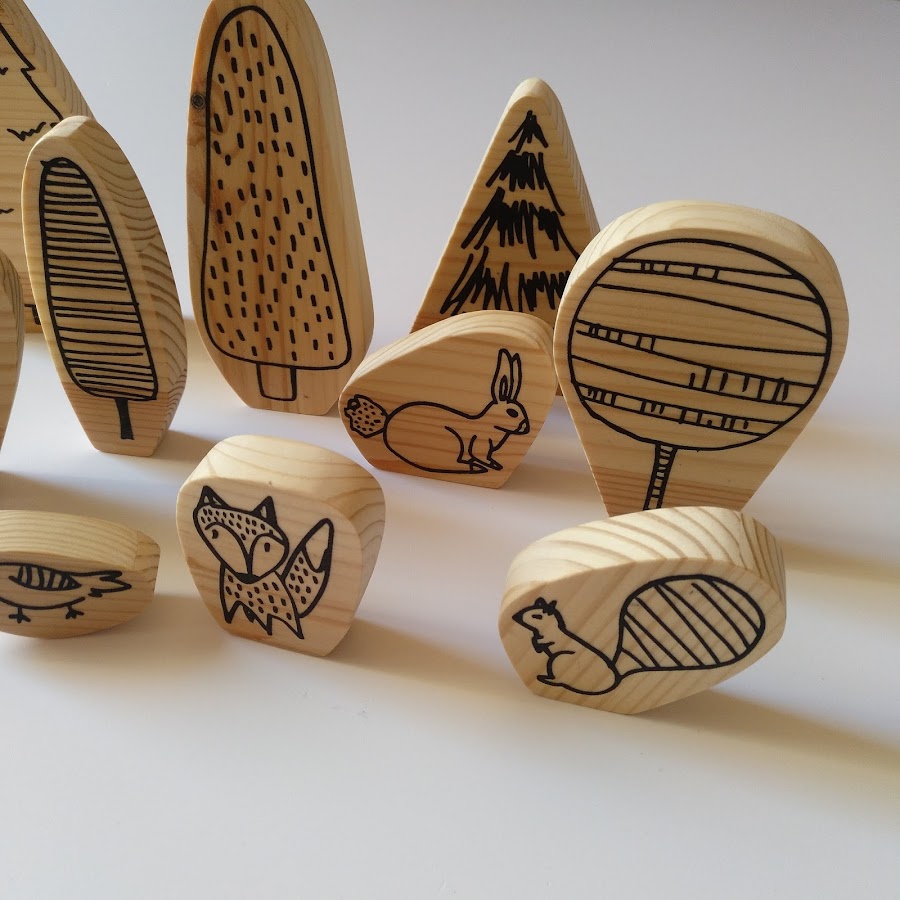 Es un material que nos ha robado el corazón, se trata de un conjunto de 11 piezas de madera; 5 árboles es y 6 animalitos representativos del bosque: un ciervo, una ardilla, un conejo, un pájaro, un zorro, y un erizo. Se presenta en una bonita bolsa de algodón.