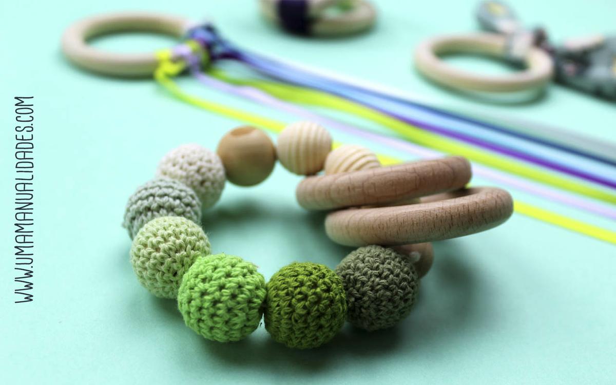 Sonajeros. Tiene piezas de ganchillo y de madera lo que permite a los bebes experimentar con distintas texturas y materiales. Al mover y chocar las distintas piezas de madera se producen sonidos estimulantes para el bebe y se trata también de un elemento muy simple de manipular por lo que a partir de los 2 meses será ideal empezar a usarlo.