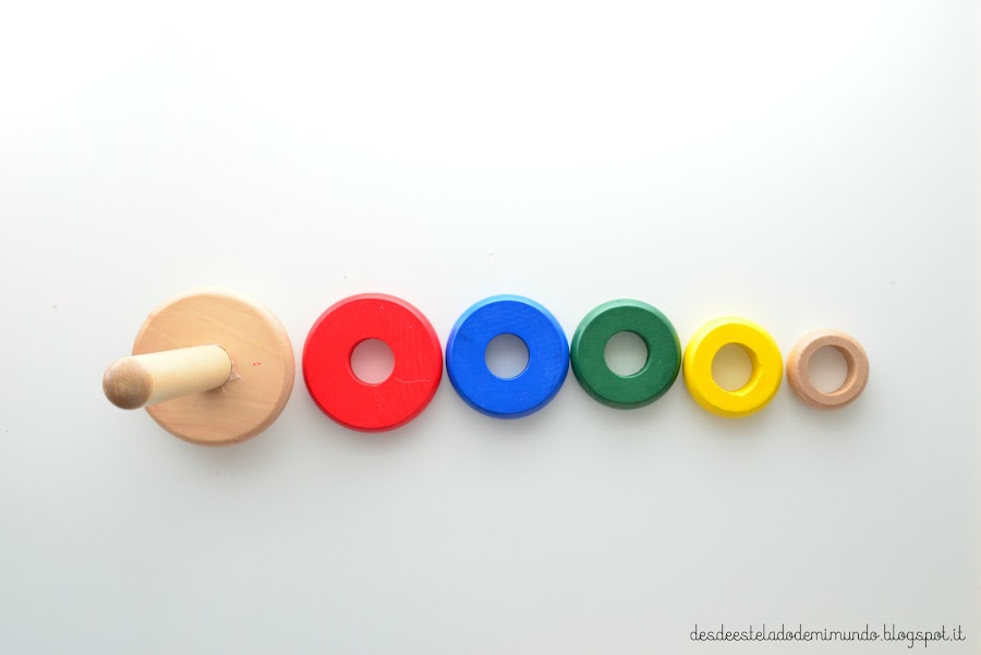 6. Por solo 2 euros en un mercado no podíamos no llevárnoslo a casa. Este juguete si que le gusta, aunque por ahora no comprende que debe ponerlos de grande a pequeño es un experto metiendo todos los aritos en el palito.