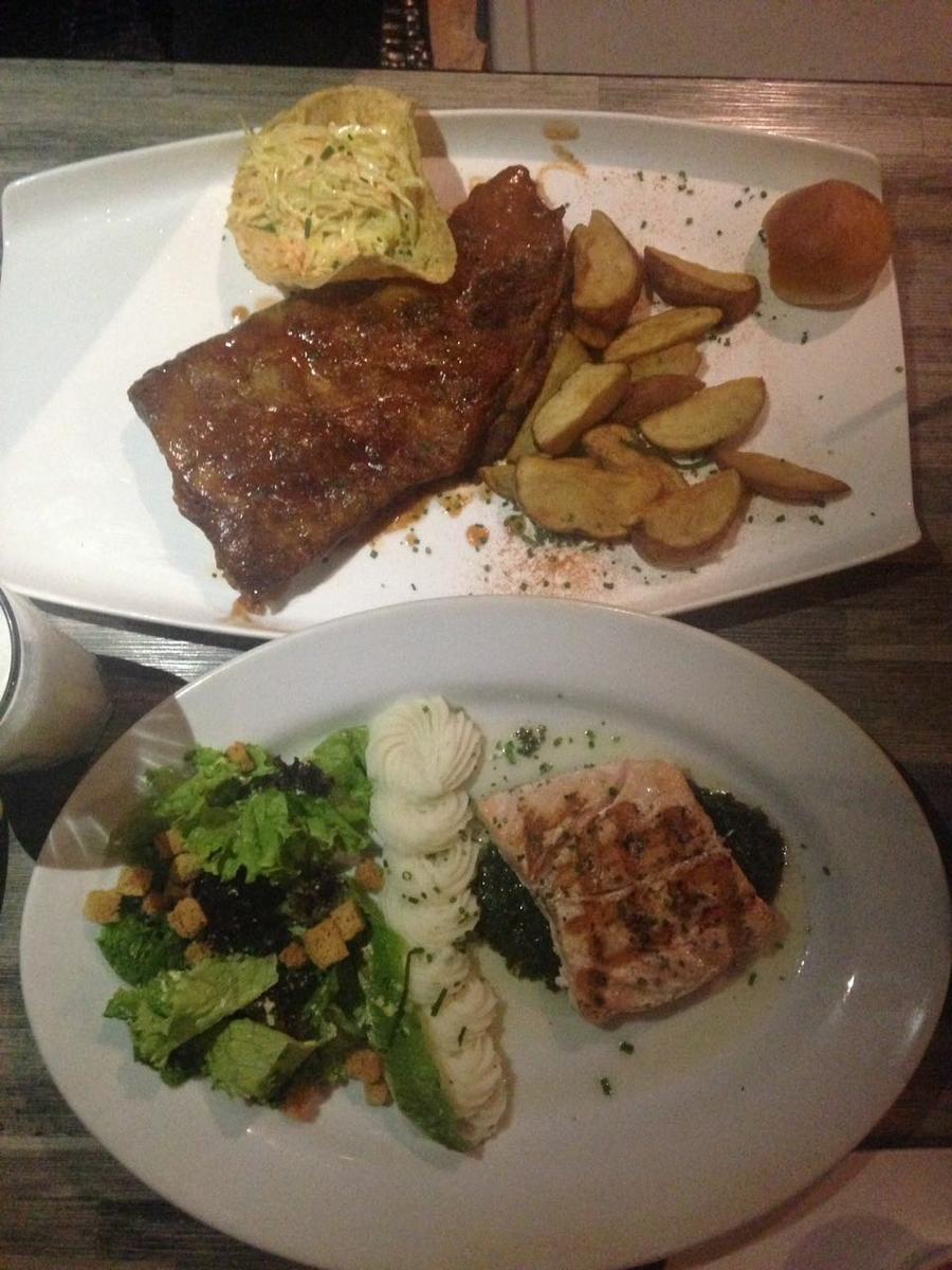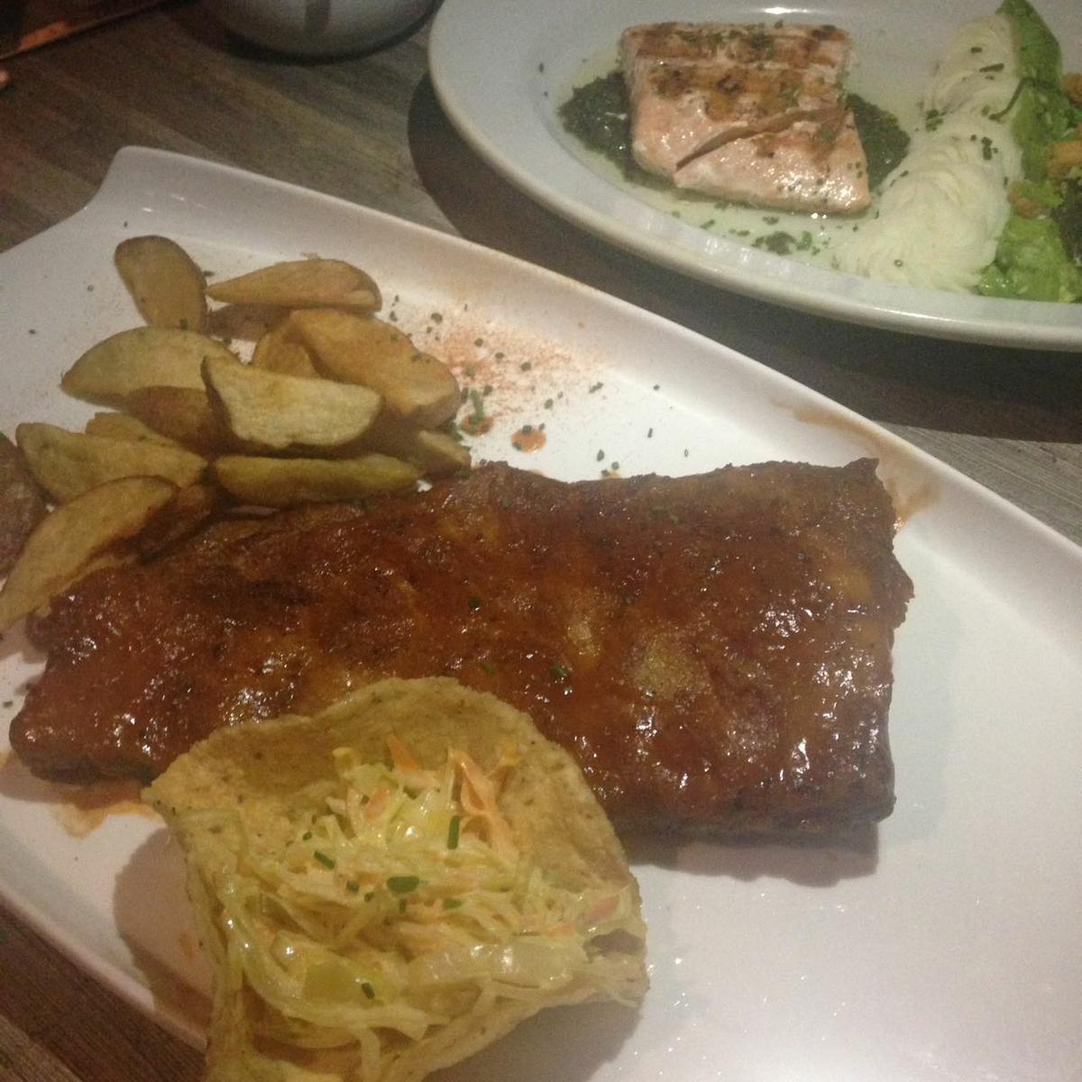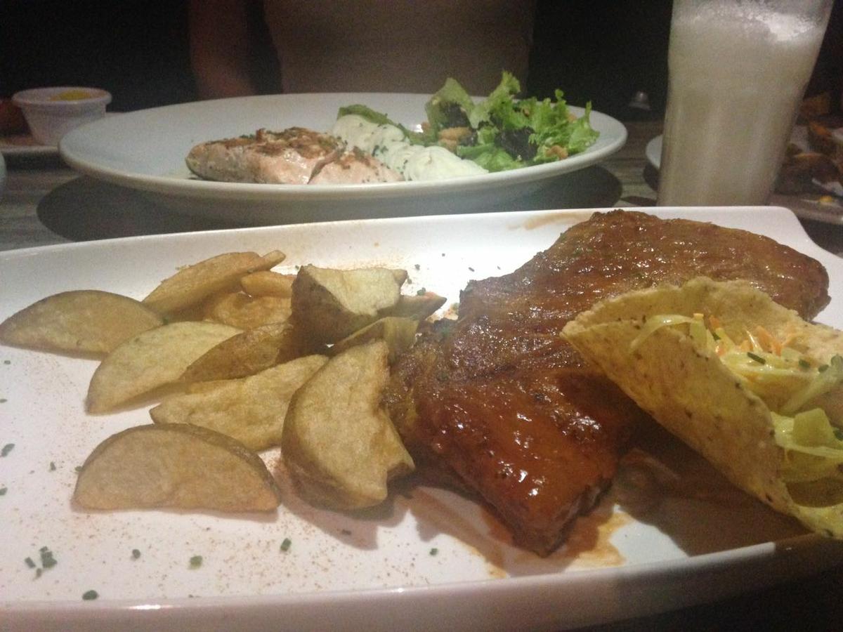 Disfrutando nuestra entrada y los peques queriendo ya salir de la mesa a divertirse en el lugar, llegó nuestra comida, unas deliciosas (realmente para chuparse los dedos) BBQ Ribs, quiero contarles algo, este plato viene en dos presentaciones 400gr y 750gr, adivinen cual pidió mi Amorsito, efectivamente 750gr, así es Will. Para mi un delicioso Salmón Parrilla que disfruté en cada bocado, para beber jugos naturales, y la limonada de coco ahora de mis favoritas. Justo al terminar nuestro mesero nos invita a subir a los juegos y actividades para ellos