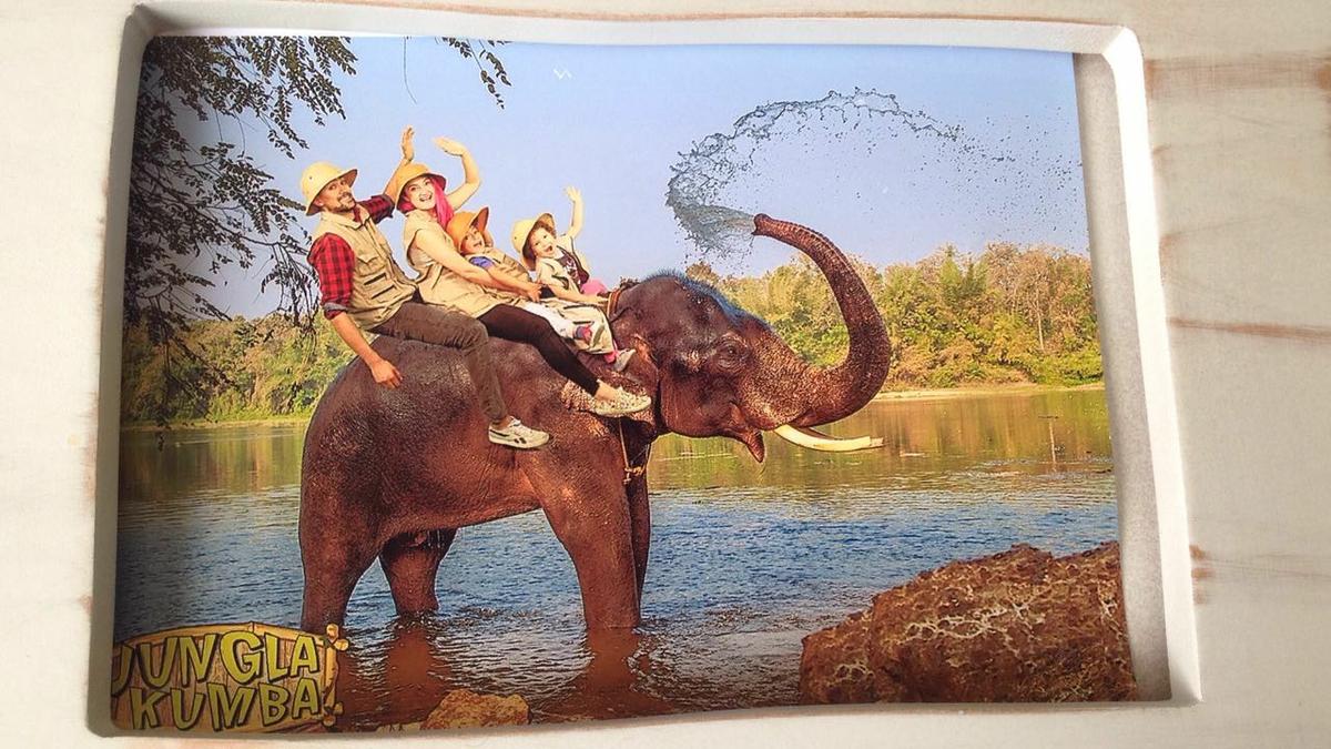 Antes de bajar a tomar el postre nos hicieron una fotografía que exhibimos orgullosos en casa, es algo hermoso, siendo en croma (pantalla verde), lo cual es difícil imaginarse la cara, el gesto o el movimiento, los niños se metieron en su papel y decían “el elefante está botando aguaaaaa! nos moja!” que imaginación más grande y absolutamente bella, mientras que Will y yo jajaja mejor vean la foto y juzguen ustedes.