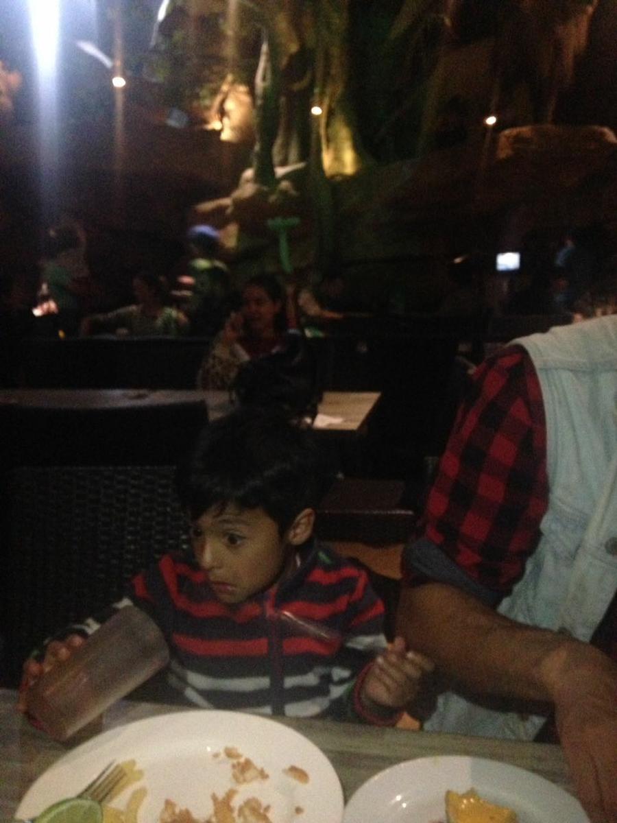 Llegó el día y muy temprano los recogimos a los dos, ya que en la mañana yo debía trabajar, los niños ansiosos decían “yaaaa por favorrrrr, ya queremos ver animales”, a medio día íbamos camino a Jungla Kumba, donde nos recibe una enorme fachada de roca con un elefante en ella; al ingresar al restaurante nos encontramos con una tienda de animales de peluche y detallitos para recordar el lugar y esto hizo que los peques empezaran a emocionarse cada vez mas, pasamos la recepción y OH! ¿quien detiene la emoción de estos niños?, nadie! cruzamos un puente donde habían “peces reales” como ellos mismos dijeron, estando ahí entre ramas, peces y una profundidad del espacio realmente salvaje nos ubican en nuestra mesa reservada, y los que tienen pequeños sabrán la emoción que causa en ellos llegar a un lugar mágico donde la diversión y los animales se juntan.