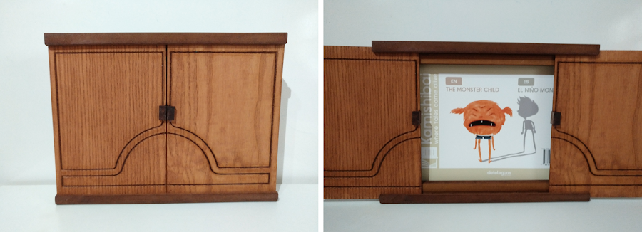 Este precioso teatro de madera barnizada con dos puertas correderas y muy ligero tiene equivalente al A4(297x210mm) es de Sieteleguas Ediciones. En la parte trasera del teatro Kamishibai, aquella resguardada a los ojos del pequeño público, es por donde se deslizan las láminas, mostrando fácilmente el mundo de fantasía que nos aguarda en cada cuento.