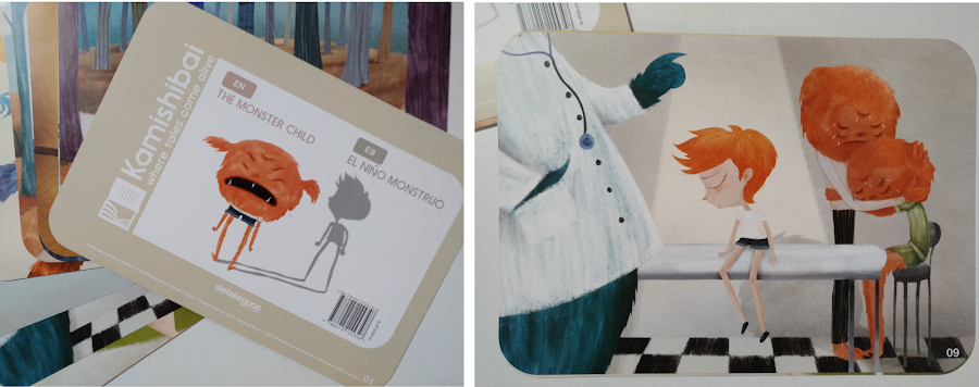 Las láminas están numeradas, así que hay que comprobar que estén ordenadas. Todas las láminas juntas se introducen en el Kamishibai con la primera mirando hacia los peques.