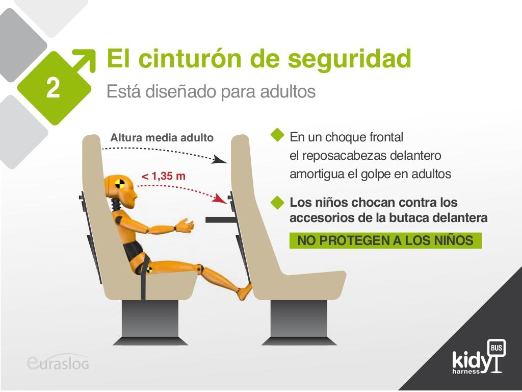 Es de locos pero no existe ninguna regulación Sistemas de Retención Infantil cuando viajan nuestros hijos en los autobuses. Cada día se desplazan miles de niños en bus a sus coles, a jugar partidos, de excursión y lo hacen sin ninguna seguridad. El pasado fin de semana, sin ir más lejos hubo un accidente de una excursión de niños en Ampuero, afortunadamente sin que ningún niño sufriese grandes daños. En los buses a veces está el cinturón, ese que te pasa por la cintura, pero que no evita que en caso de colisión el tronco y la cabeza de niño impacte contra la trasera del asiento que tiene delante. Un golpe en la cabeza, incluso a velocidades moderadas, puede causar grandes daños cerebrales e incluso la muerte. A 50 Km/h un niño de 20Kg choca contra el cristal o la bandeja del asiento delantero con una fuerza equivalente a 500Kg.