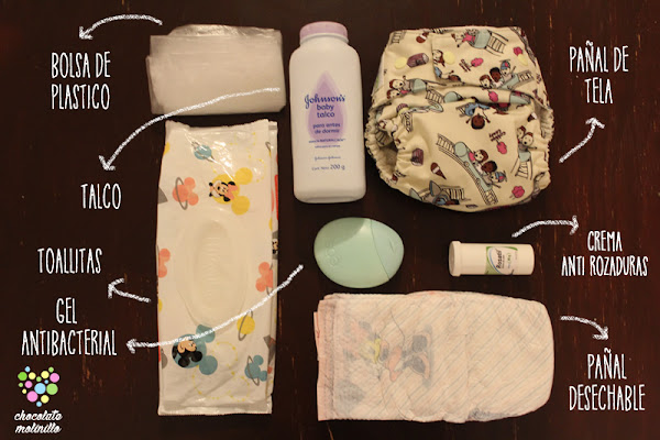 El kit de cambio de pañal se compone de: pañales (cuando usamos de tela llevamos siempre de reserva uno desechable por si las moscas) talco y cremitas anti rozaduras (para el pañal desechable), toallitas húmedas, sabanita o cambiador (nunca compramos un cambiador portátil tal cual pues se nos hacía bastante estorbozo más bien usábamos una sabanita delgada o inclusive la chamarra de papá sirve muy bien), gel antibacterial por si no podemos lavarnos las manitas y bolsas de plástico desechables, por que aveces el bote de basura queda algo lejos y disimulan muy bien el olor.