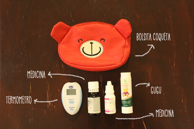 Otra cosa básica cuando sales es un mini botiquin, esto también va a depender bastante de la edad o por ejemplo si está bajo tratamiento farmacológico, puedes guardar sus medicinas en una bolsita linda. Nosotros cargamos con medicamento para la fiebre, un termómetro digital, y un ungüento para golpes (éste es de la marca Herbolare, se llama Stick Gugu y esta hecho con aceites de manzanila y árnica que alivia los dolores y moretones de los golpes, es muy práctico pues parece lapíz adhesivo y a mi peque le encanta usarlo, rasguñito que se da y corre a pedir gugu por que le es muy divertido usarlo y ponerselo solita, calma super bien los berricnhes también.