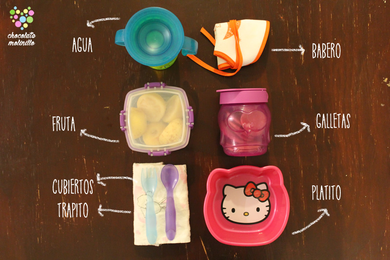Cuando el peque ya está en la alimentación complementaria y tardarás en volver a casa puedes llevar comida para llevar, recuerda que quizás no tendrás donde guardarla, procura que sean alimentos que puedan estar a temperatura ambiente, no olvides snacks saludables como fruta picada, cerealitos, agua y algo bien importante si tu peque ya come en los restaurantes lleva sus propios platitos y cubiertos, por seguridad e higiene y por qué muchas veces no tienen trastes seguros que ellos puedan utilizar. Tampoco olvides un buen babero y un trapito para limpiar el desastre. Y un vasito con agua natural por si el camino es caluroso.