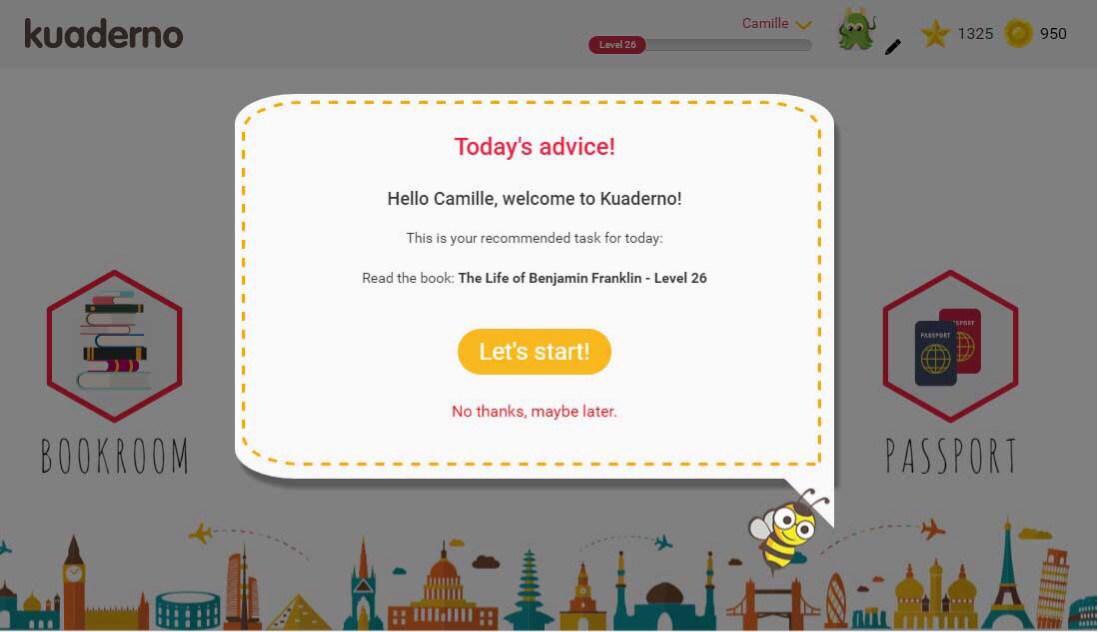 En todo momento Kuaderno va incentivando al niño para que realice las actividades que le permitirán seguir avanzando y subir de nivel.