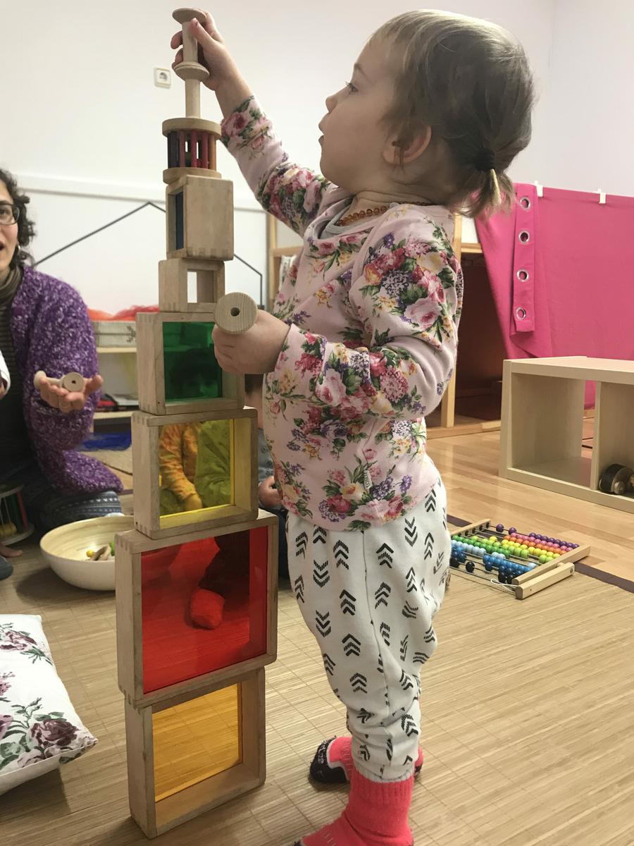 Pues bien, Valentina ha estado yendo conmigo a la escoleta durante estos dos años. Cada mañana íbamos y estábamos allí unas 2-3 horas. El primer año básicamente jugábamos las dos juntas. Prácticamente no tenía interacción con otros compañeros más que el mero hecho de compartir un espacio. El segundo año la cosa poco a poco iba cambiando, ella se separaba más, aunque siempre siempre me buscaba y necesitaba saber dónde estaba. Además, es una niña muy sensible y cuando las necesidades básicas no estaban cubiertas (sueño y hambre) estaba muy alterada. En enero de este año, es decir, cuando Valentina tenía 2 años yo empecé a quedarme en un espacio donde habían niños más pequeños; y por lo tanto juguetes, actividades y propuestas pensadas para niños más pequeños y que a ella no le “interesaban” tanto. A ella lo que le gustaba era estar en el otro espacio, donde había materiales de movimiento, niñ@s de su edad y propuestas que le atraían. En este momento a ella sí que le apetecía interactuar más con iguales.
