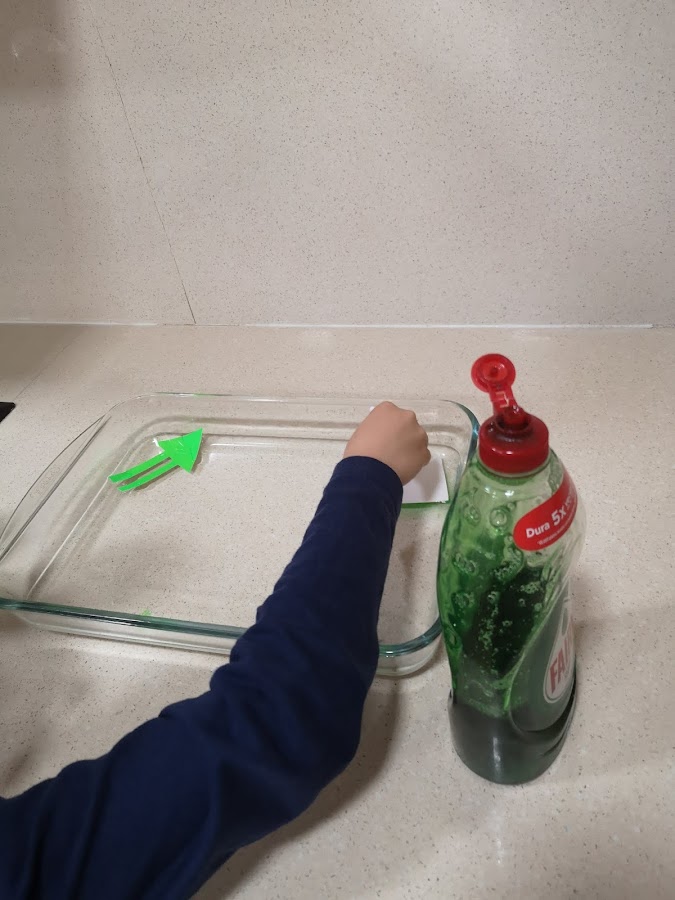 Se trata de una flecha casera de cartulina que nada por la superficie de nuestra bañera casera.
