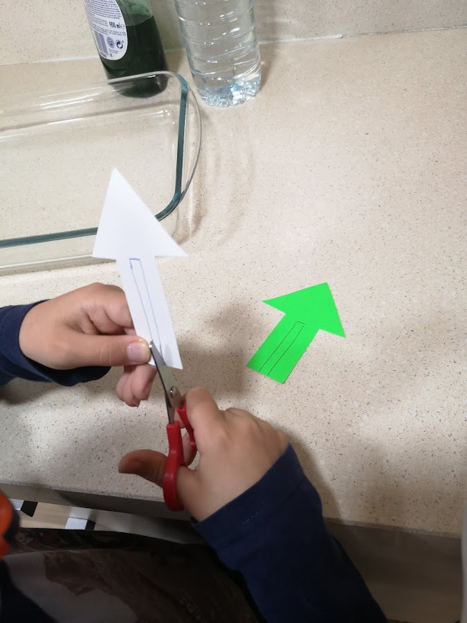 Recortar una cartulina en forma de flecha y según foto también por el medio para que navegue muy bien