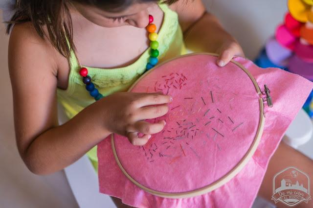 Es importante darle la oportunidad al niño/a para que elija los colores de la tela y los hilos que quiera utilizar cada momento. Mejor si le ponemos el hilo doble y dejamos que haga las puntadas libremente por la tela. Procurando eso sí, que intente hacerlas pequeñas, sino, en cuatro puntadas grandes ¡acaba con el hilo!