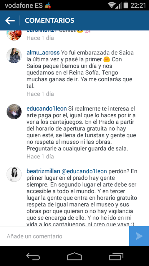 Además aprovecho para desarrollar en este post la idea que parece que a generado la polémica.En otras ocasiones ya he escrito sobre museos o la importancia de dale al arte el valor que tiene en la sociedad, lo podéis leer aquí, aquí, o aquí Por supuesto que es lícito aprovechar cuando un evento artístico es gratuito para ir a disfrutarlo y para ir introduciendo a los pequeños en el disfrute del arte, sobre todo en una época de vacas flacas como la actual. Pero de eso a decir que el arte debería ser gratis hay un trecho enorme. Un argumento simple podría ser “ Y porqué no es gratuita la peluquería, al fin y al cabo casi todo el mundo necesita cortarse el pelo o peinarse, o las gafas, porqué demonios no son gratis las gafas”. En realidad los museos no son gratis, afortunadamente, y por eso siguen existiendo artistas, conservadores, guías, fabricas de pintura, etc. el arte que consumimos en estos lugares incluso cuando la entrada es gratuita está subvencionado. Por desgracia en la sociedad de consumo en la que vivimos solamente valoramos las cosas cuando se les pone un precio (por ahí iba yo en la dichosa respuesta en Instagram) Por eso creo que una forma de educar a los niños en la importancia de la cultura es que nos vean pagar por arte, igual que nos ven pagar por otras cosas importantes y cotidianas de la vida como la barra de pan o el autobús. Además cuando vamos a un museo nos comportamos siguiendo unas reglas, lo mismo que si me invitan a una casa donde se descalzan en la entrada y hago lo propio. Esto no quiere decir que se tenga que entrar con una escoba metida en el culo, al contrario los museos son lugares para disfrutar y las visitas con niños deben ser lo más lúdicas que se pueda. Siempre claro está respetando la visita de los demás y las normas de cada museo ( Reconozco que en este punto sí que te di un pequeño tirón de orejas porque en el Prado no se pueden sacar fotos, en otros museos sí en el Prado no)