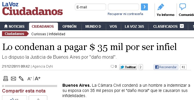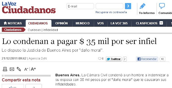 Ayer leí una noticia que me llamó mucho la atención: un juzgado condenó a un hombre infiel a pagar $ 35.000 a su ex mujer por daño moral.