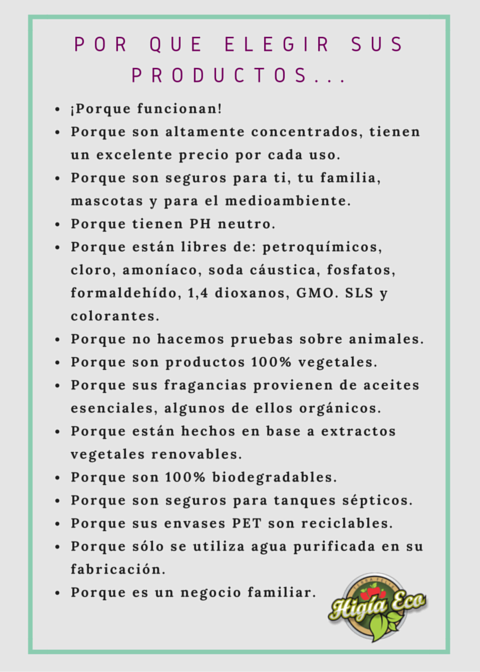 Los productos de limpieza ecológicos son de base vegetal (y por tanto biodegradables), no utilizan petroquímicos, colorantes, conservantes, fragancias ni enzimas.