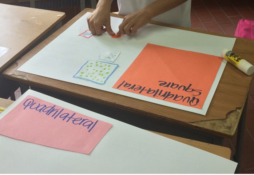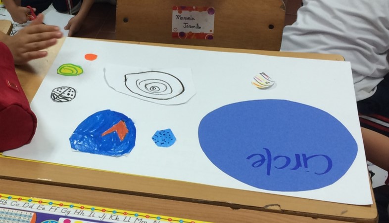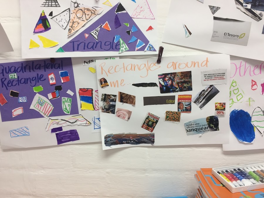 Una vez que observé que conceptos de figuras tenían los estudiantes, en la siguiente clase les llevé un cuadrado, un rectángulo, un cuadrilátero irregular, un círculo, un triángulo, un pentágono y un hexágono y les pregunté a los niños si conocían los nombres de estas figuras. La mayoría los conocían, así que a medida que me decían los nombres yo los escribí en las figuras para que pudieran visualizar y memorizar estos nombres. Pegamos estas figuras en unos cuartos de cartulina.