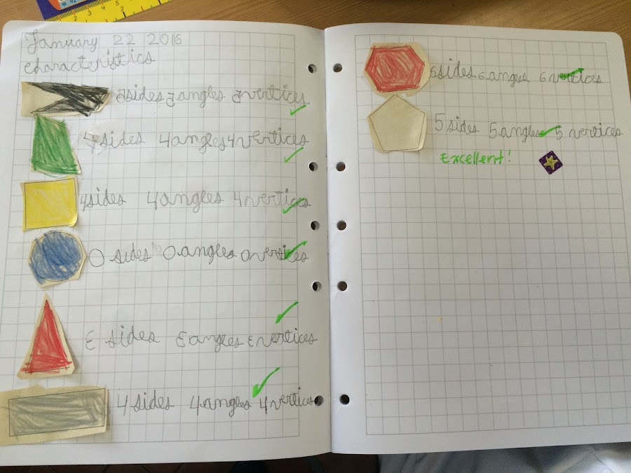 Para concluir este primer trabajo de las figuras estudiamos las características de las figuras: los lados y los vértices. Los niños recibieron un set de figuras que colorearon y recortaron para poder manipularlas y contar más fácilmente sus características. Después las pegaron en el cuaderno y al frente escribieron el número de lados, ángulos y vértices. Al ir haciendo el ejercicio ellos mismo fueron llegando a al conclusión de que el número era el mismo.