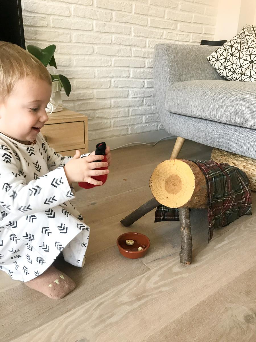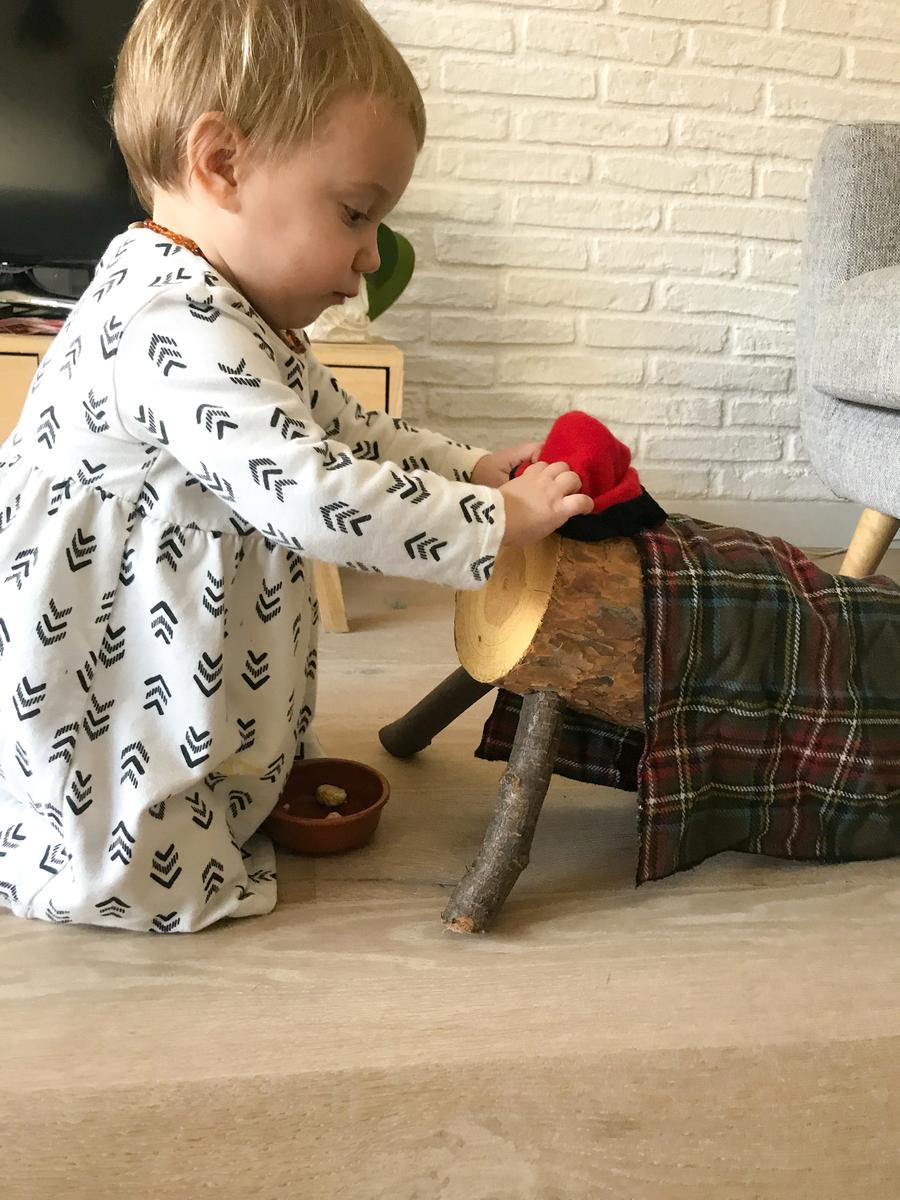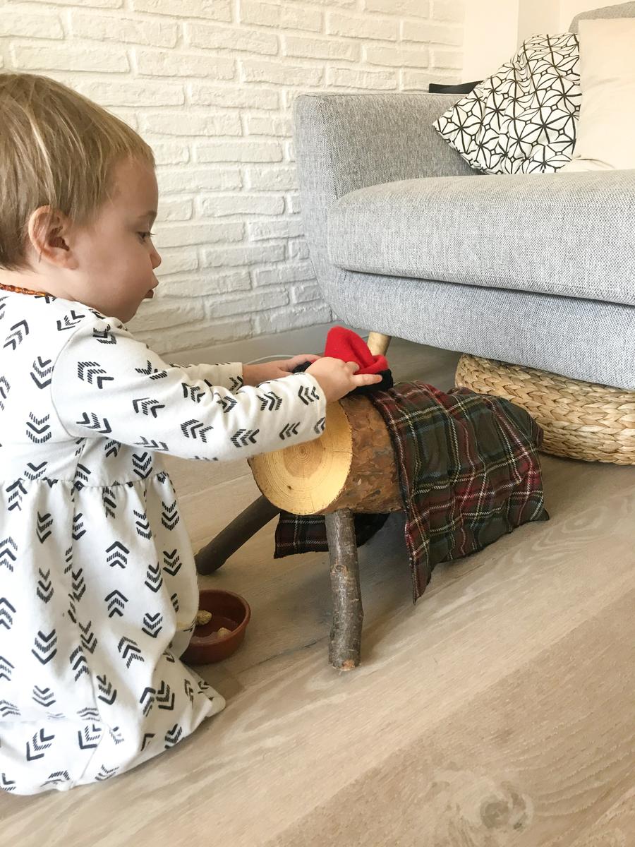 Bien, nuestro Tió no tiene cara por dos motivos: el primero porque si lo que queremos es fomentar su imaginación, yo prefiero que Valentina se imagine en los trozos de madera una boca o unos ojos, que sea ella misma la que en su mente cree como es su personaje. Y segundo, porque nos parece “más real” que una cara pintada. La sociedad lo ponemos muy difícil con tantos Papa Noeles (algunos en muy malas condiciones) en todas las tiendas y centros comerciales. Realmente los niños no necesitan tanto para creer, de hecho no necesitan nada. Si una caja puede ser un tren, una rama un avión y piedras los mayores tesoros guardados en las manos durante horas.