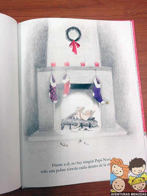 Así que Nicolás sale de su escondite y con su linterna enfoca hacia la chimenea. Pero allí no está Papá Noel, solo una tórtola que se ha caido por la chimenea. Su gatita intenta ir a la caza de la tórtola, pero Nicolás se lo impide y la coge suavemente para protegerla.