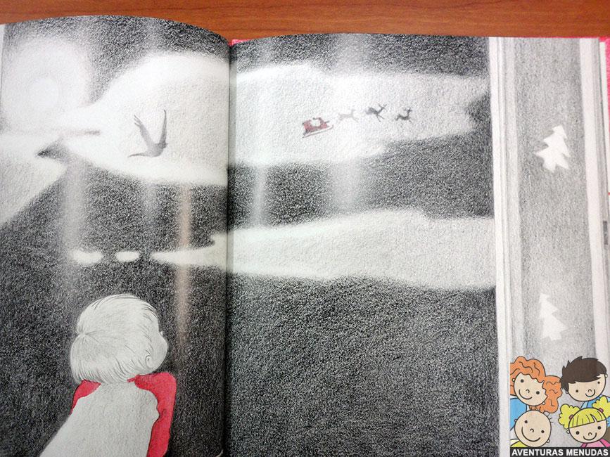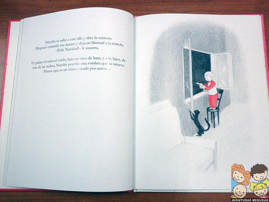Con cuidado la lleva a la ventana y la deja salir volando en libertad. Mientras alza la vista siguiendo a la tórtola, Nicolás parece ver la figura de un trineo tirado por renos a lo lejos.