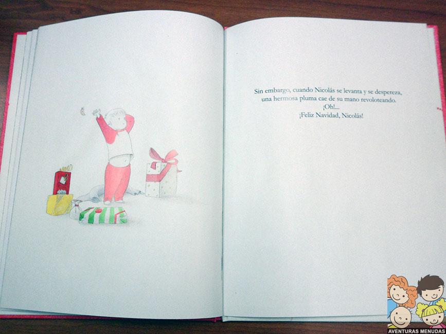 El cuento está escrito en castellano, en letra de imprenta y con un estilo muy sencillo y cercano. Es fácil de leer, de seguir la historia y de entenderla. Resulta entrañable todo lo que le pasa a Nicolás y los peques desean saber si al final se encontrará con Papá Noel o no. Están expectantes durante todooooooooo el relato.