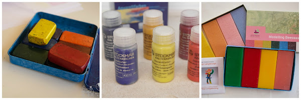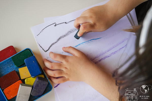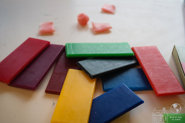 En casa tenemos: bloques de cera para colorear, acuarelas para experimentar el color y cera de modelar.