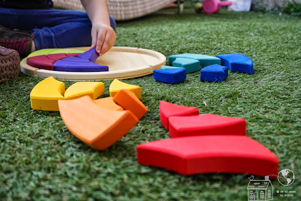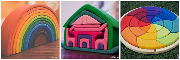 Los elementos de construcción típicamente Waldorf como el arcoíris, o los puzles de madera, ofrecen todas las utilidades que la imaginación permite.