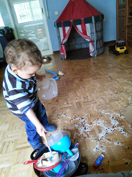 En un dia frío y lluvioso como hoy, en los que ir al parque no es una opción, se me ha ocurrido jugar con granos y pasta, he hecho una mezcla con recomendaciones de otras bloggers, y bueno salió esto. Las actividades con MiniMoi no suelen durar mas de quince minutos, esta podría decirse que ha sido un éxito, ha durado 45 minutos. Cuando se cansó, él mismo recogió y llevó parte de los trastos a la cocina y me ayudó a meterlos al lavavajillas.