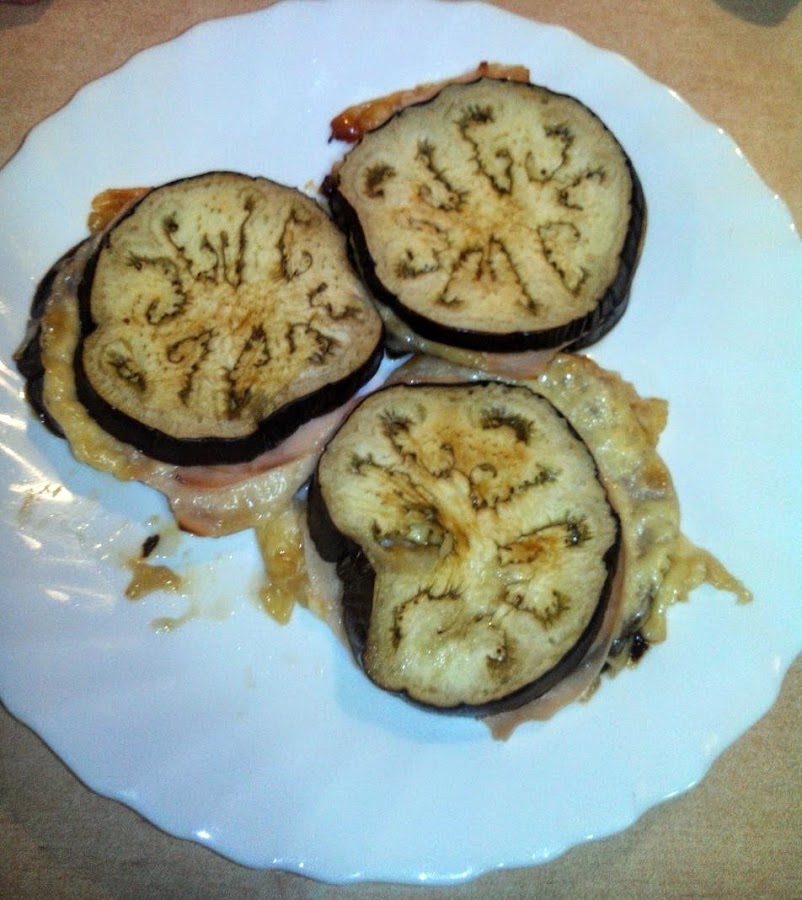 Cortamos las berenjenas en rodajas de un dedo de grosor. Las salamos y las dejamos escurrir un rato para que suelten el amargor. Pasados unos 5/10 minutos, quitamos el sobrante de sal y colocamos la mitad en una fuente de horno, previamente engrasada con una gota de aceite. Encima de cada rodaja colocamos una loncha de jamón/pavo, otra de queso, nuevamente jamón/pavo y coronamos con otra rodaja de berenjena. La tapa de arriba la pintamos con otro poco de aceite y al horno (que previamente habremos calentado), 10 minutos a 200º.