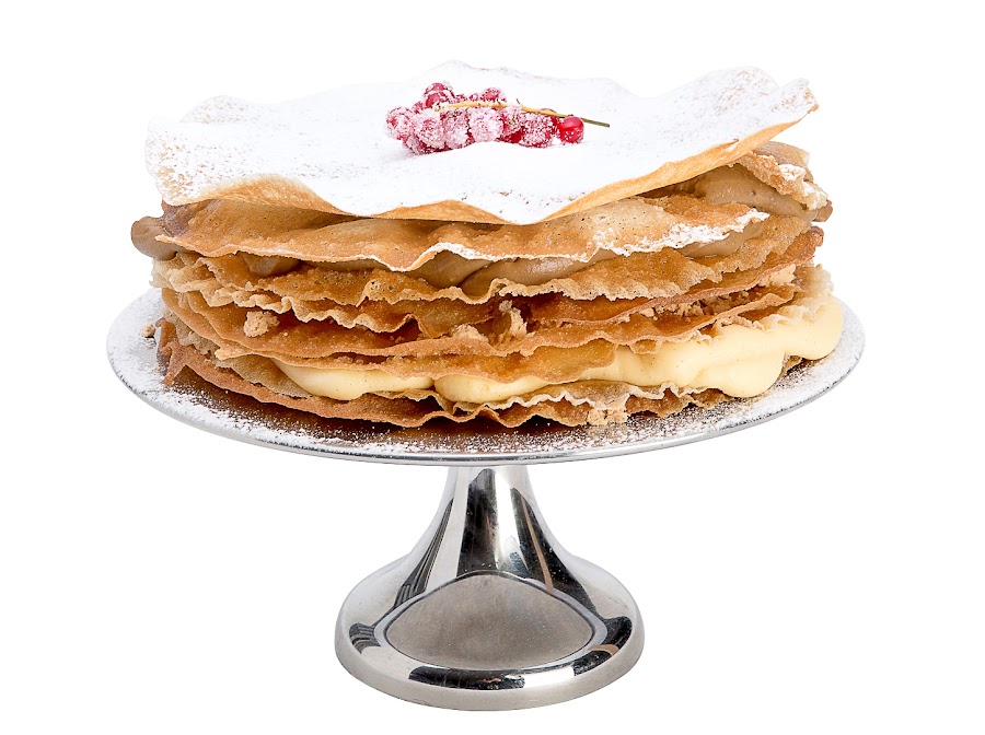 A la hora de montar el pastel disponemos las capas de la siguiente manera: Hojas brick de dos en dos, extendemos encima la crema pastelera de café con ayuda de una manga pastelera, de nuevo 2 hojas de brick, volvemos a extender crema pastelera y por último 2 hojas de brick y coronamos el pastel espolvoreando azúcar glass.