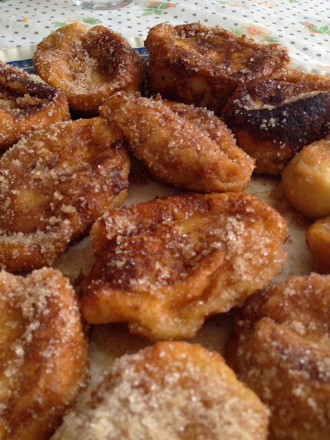 Se corta la barra de pan en rebanadas, como de dos dedos de grosor y se colocan en una bandeja honda. Mientras se pone a calentar la leche con la rama de canela y dos cucharadas colmadas de azúcar. Antes de que rompa a hervir, se retira la leche y se echa sobre el pan cortado. A continuación preparamos una mezcla de azúcar y canela y reservamos. Después batimos el huevo. Pasado un rato que se empape bien el pan en la leche, lo pasamos por el huevo batido y vamos friendo cada torrija en aceite buen caliente. Cuando estén fritas las rebozamos en la mezcla de canela y azúcar y las dejamos en una bandeja. Ellas solas, según se vayan enfriando, irán soltando el almíbar que tanto gusta en casa.